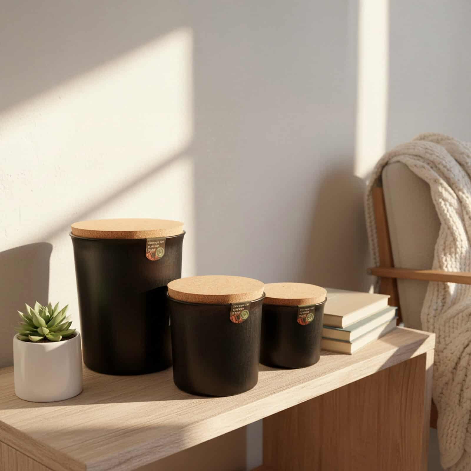Deze set potten is gemaakt van koffiedik: stevig, natuurlijk en met een warme uitstraling. Perfect voor alles wat jij een mooi plekje gunt.