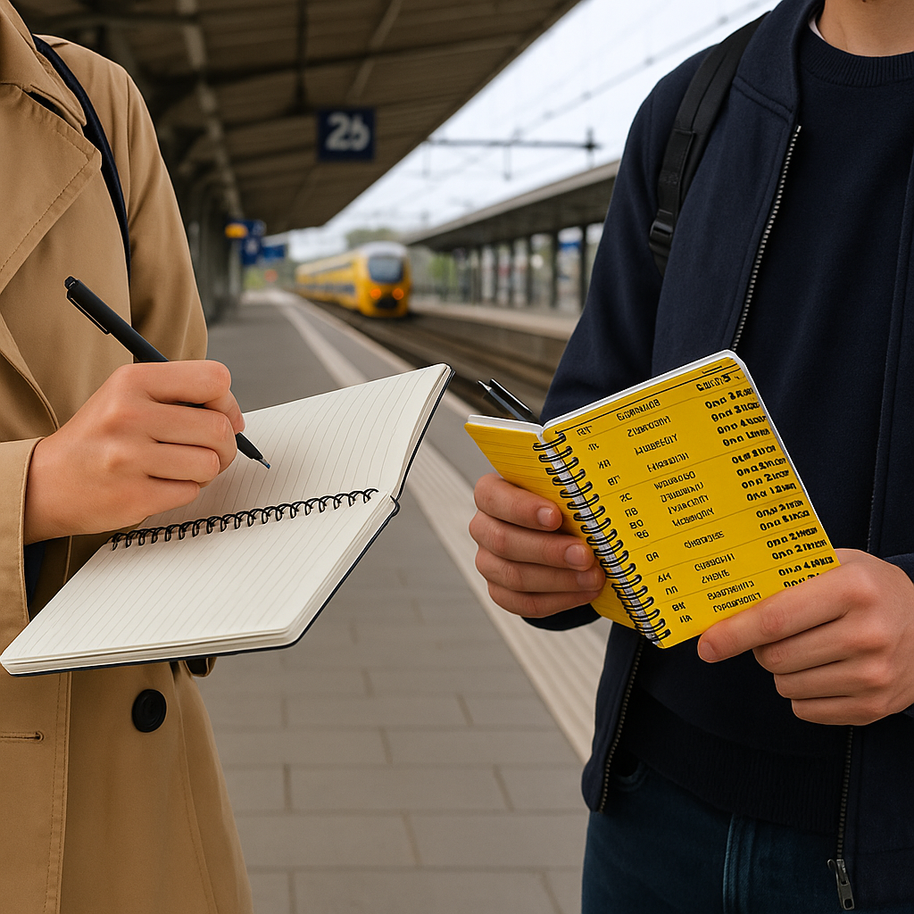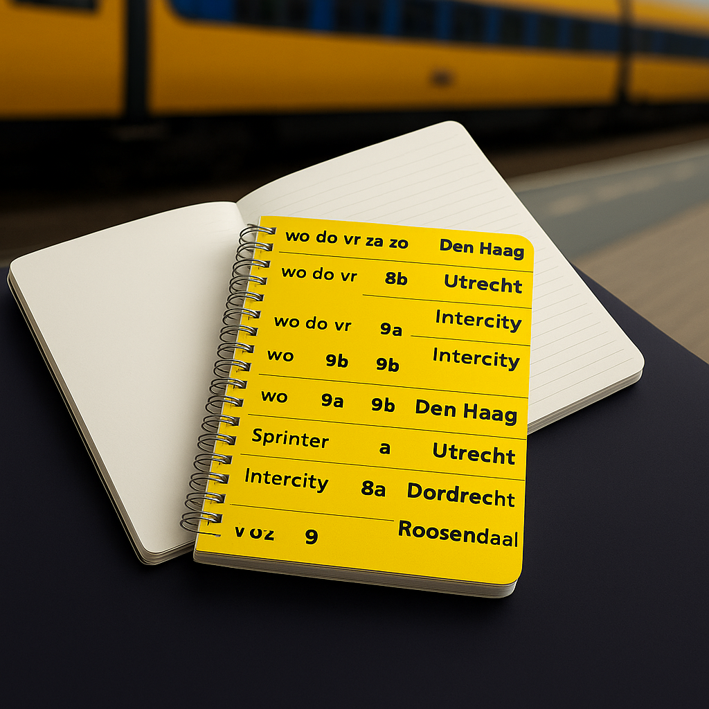 Een Spoorblok is een notitieboek met een voor- en achterkaft van treintijdborden. Ieder exemplaar is anders. De plaatsnaam die ooit op het perron hing, krijgt een tweede leven op jouw notitieboek.